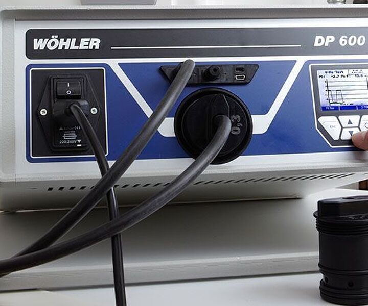 The Wöhler DP 600 simulates the combustion air inlet of a fireplace. After the user has entered the capacity of the fireplace, the Wöhler DP 600 will produce automatically the corresponding volume flow which passes through the chimney and will register the pressure progression in the room.